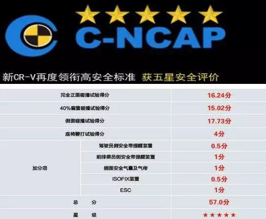 除了在美國的IIHs的測試中獲得高分評價,在國內(nèi)的C-NCAP碰撞測試中CR-V也成為了優(yōu)勝者,在新的C-NCAP的測試中采用了更為嚴苛的測試標準和全新的評分體系,東風本田CR-V仍以57分的成績摘得首批新規(guī)定測試車型的最高分,并與成績排名第二的車型拉開了4.1分的差距。