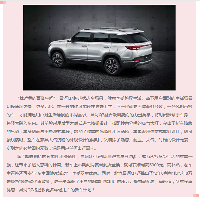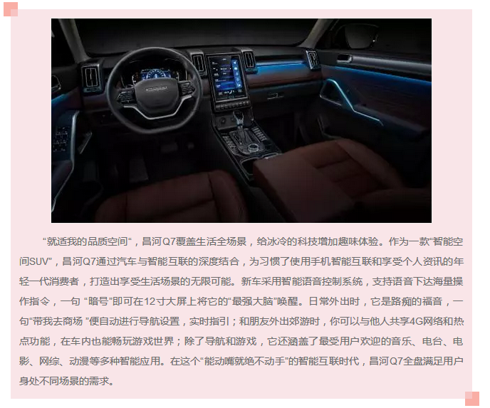 昌河Q7定位為“智能空間SUV“,為充滿活力的,喜歡表達(dá)自我、享受當(dāng)下,更渴望嘗試新鮮事物的年輕一代消費(fèi)者量身打造,新車打出“就適我的空間”這一鮮明產(chǎn)品主張,旨在為互聯(lián)網(wǎng)下的新世代年輕人創(chuàng)造一部能夠滿足日常通勤、商務(wù)、娛樂等全場(chǎng)景需求的全能產(chǎn)品。