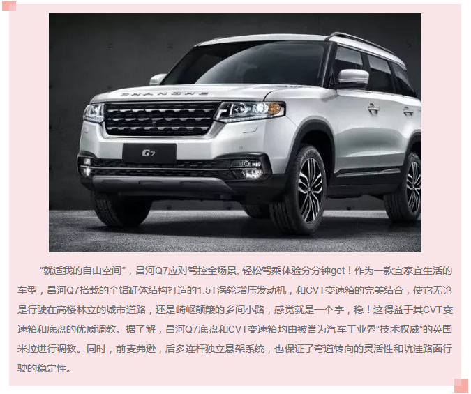 憑借全能又多變的產(chǎn)品力優(yōu)勢(shì),昌河Q7不僅能夠滿足時(shí)下消費(fèi)者注重的個(gè)性化需求,又能完美兼顧不同生活場(chǎng)景的應(yīng)用,用其全適應(yīng)、全場(chǎng)景的定位拓展了人們對(duì)于SUV認(rèn)知的邊界,展示了SUV車型未來(lái)的發(fā)展風(fēng)向,那就是人、車、生活的完美統(tǒng)一和無(wú)縫結(jié)合。“就適我的”Q7,就是我的生活,這就是昌河Q7想要帶給互聯(lián)網(wǎng)時(shí)代下年輕一代的未來(lái)移動(dòng)生活方式。