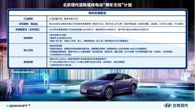 2020年3月10日,北京現(xiàn)代舉行菲斯塔純電動(dòng)——純電時(shí)尚魅力座駕線上發(fā)布會(huì),現(xiàn)場(chǎng)公布國(guó)補(bǔ)后售價(jià)為17.38-19.88萬(wàn)元,并推出“擁車無(wú)憂”的購(gòu)車政策。消費(fèi)者購(gòu)買菲斯塔純電動(dòng)可在國(guó)補(bǔ)后售價(jià)的基礎(chǔ)上再享受3萬(wàn)元的高額購(gòu)車禮遇,以及3年免息、超值置換補(bǔ)貼等多重福利。