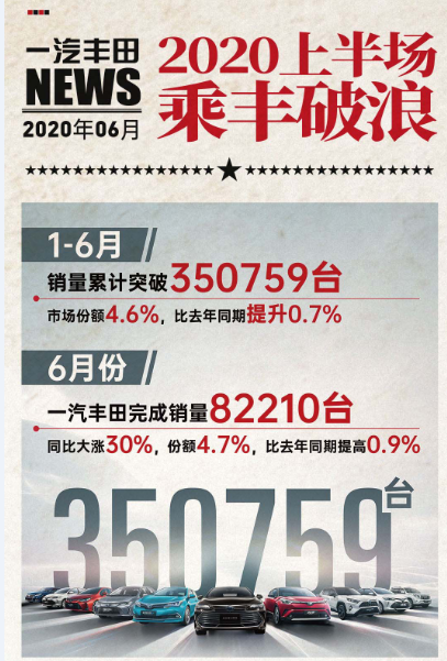 今年1-6月,一汽豐田銷量突破35.1萬(wàn)臺(tái),領(lǐng)先乘用車市場(chǎng)大盤14個(gè)百分點(diǎn),市場(chǎng)份額同比提升0.7個(gè)百分點(diǎn)到4.6%。更可貴的是,反彈勢(shì)頭強(qiáng)勁,剛剛過(guò)去的6月,一汽豐田銷量突破8.2萬(wàn)臺(tái),同比增長(zhǎng)高達(dá)30%。