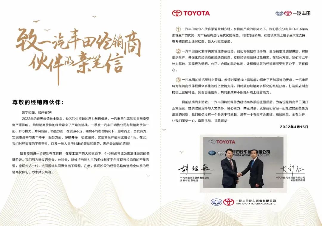 在告經(jīng)銷商書(shū)中,胡紹航動(dòng)情表示,雖然2022年的春天比預(yù)期來(lái)得要晚一些,但“沒(méi)有什么可以阻止春的腳步”。一汽豐田希望憑借不斷強(qiáng)化的品牌、產(chǎn)品、渠道以及綜合體系力,逆勢(shì)而行實(shí)現(xiàn)更高的站位。