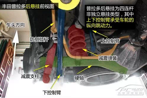 普拉多后四連桿結(jié)構(gòu)帶止推桿,止推桿一頭連接在車身上,一頭連接到硬軸上,承受硬軸的側(cè)向力作用,上下控制臂則承受車輪的上下跳動力。后懸掛減震彈簧頂部內(nèi)嵌有橡膠,在彈簧壓縮至極致時起到緩沖保護作用。
