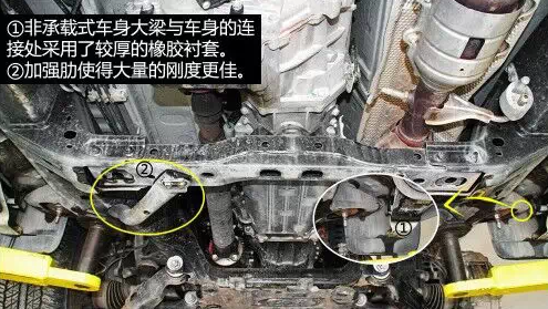 車身大梁中部有加強肋,大大提高了剛度,大梁與車身的連接處使用了較厚的橡膠襯套,慮振效果較好。油箱有金屬蓋板保護,上面有導(dǎo)流槽以及通風(fēng)孔,有利于氣流快速通過并且?guī)ё邿崃俊!≈醒氩钏倨鲙Р钏冁i,為托森限滑差速器類型。 后為開放式差速器,不帶差速。前后減震支柱均為日本制造。