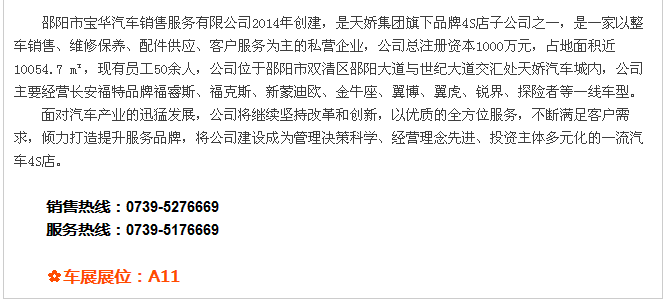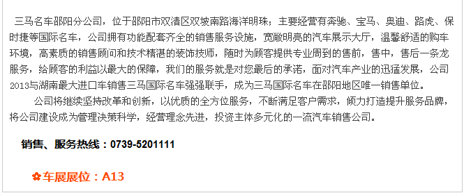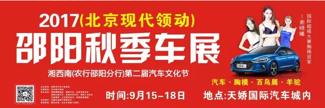 【915-918邵陽(yáng)秋季車展】 9月15日-9月18日,2017湘西南第二屆汽車文化節(jié)暨(北京現(xiàn)代領(lǐng)動(dòng))邵陽(yáng)秋季車展將于天嬌國(guó)際汽車城隆重舉辦。本屆車展由邵陽(yáng)市政府批準(zhǔn)、邵陽(yáng)市汽車行業(yè)商會(huì)主辦、北京現(xiàn)代領(lǐng)動(dòng)冠名,邵陽(yáng)順馳起亞、獵豹汽車、永馳東南汽車、邵陽(yáng)眾泰汽車、和昌長(zhǎng)安汽車、邵陽(yáng)三馬名車、天嬌福特、大漢通寶寶馬、邵陽(yáng)新奧奧迪協(xié)辦,合作銀行為:中國(guó)農(nóng)業(yè)銀行股份有限公司邵陽(yáng)分行。此次車展不僅僅是一場(chǎng)視覺(jué)的盛宴,更是一場(chǎng)震撼的汽車文化之旅!今天小編就給大家著重介紹一下此次車展冠名及協(xié)辦單位。