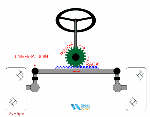 轉(zhuǎn)動轉(zhuǎn)向盤時,可帶動小齒輪轉(zhuǎn)動,這個小齒輪與一條齒條相吻合,帶動齒條左右直線運(yùn)動,并推動轉(zhuǎn)向輪左右擺動,從而實現(xiàn)轉(zhuǎn)向功能。齒輪不是簡單的平齒輪,而是特殊的螺旋形狀,這可改善轉(zhuǎn)向時的柔順感。