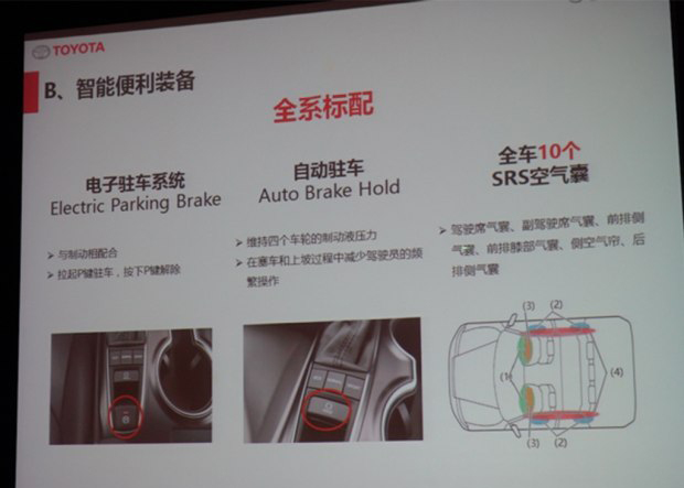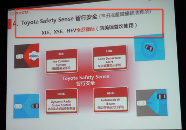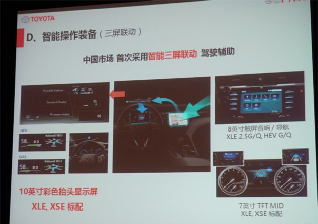 配置方面,根據(jù)早前獲得的車型信息介紹圖片,新車將全系標(biāo)配電子駐車系統(tǒng)、自動(dòng)駐車、全車10個(gè)SRS氣囊(主/副駕駛席氣囊、前排側(cè)氣囊、前排膝部氣囊、側(cè)氣簾、后排側(cè)氣囊)。此外,在XLE、XSE兩款車型中將標(biāo)配10英寸彩色抬頭顯示屏、7英寸TFT MID行車電腦等配置。同時(shí),在HEV車型中將配備自動(dòng)化性控制系統(tǒng)(AGC:Auto Glide Control)以及采用了全新開發(fā)的Hyper Prime Nicke電池等。值得一提的是,未來根據(jù)車型配置的不同還將配備全景監(jiān)控系統(tǒng)(PVM)和并線盲點(diǎn)監(jiān)測系統(tǒng)(BSM)配置。