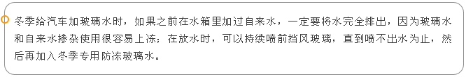 如果太陽(yáng)曬不開(kāi),也可以在玻璃水水箱中加一些溫水(不可以加開(kāi)水),待化開(kāi)玻璃水后,盡快將水排出,以免再次凍住,然后加入冬季專用玻璃水。
